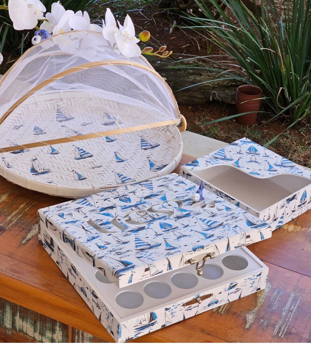 1 Porta pão bambu 40cm com aplique de peixe em porcelana.