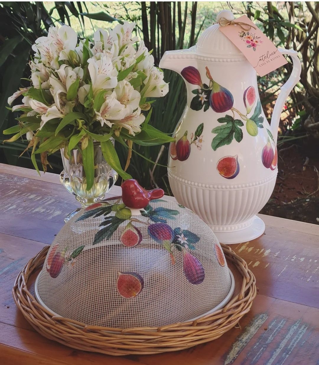 1 boleira 30cm, base em vime e vidro e puxador de passarinho em porcelana.